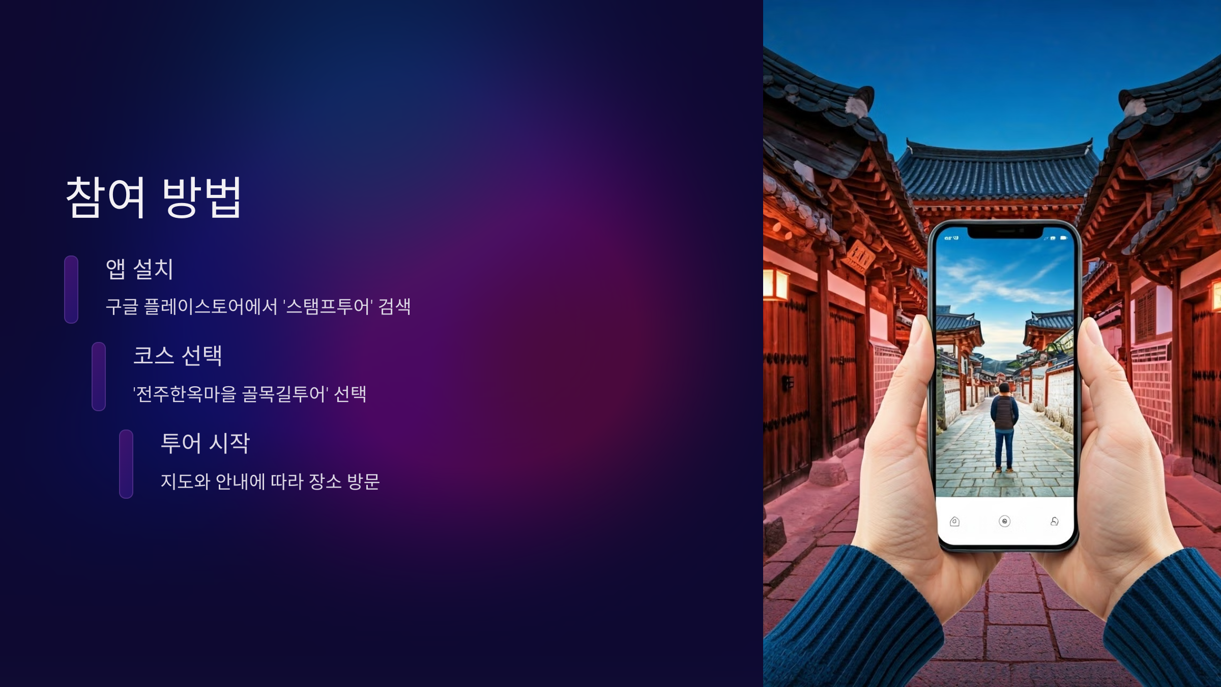 - 코스 선택: 앱에서 '전주한옥마을 골목길투어'를 선택합니다.