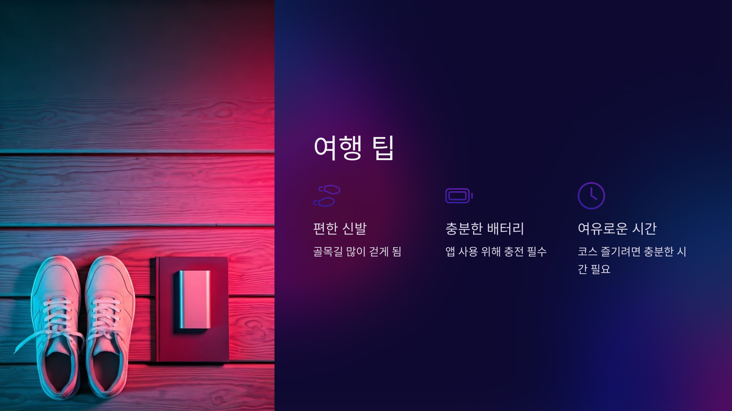 • 여유로운 시간: 각 코스를 여유롭게 즐기려면 충분한 시간을 확보하세요.