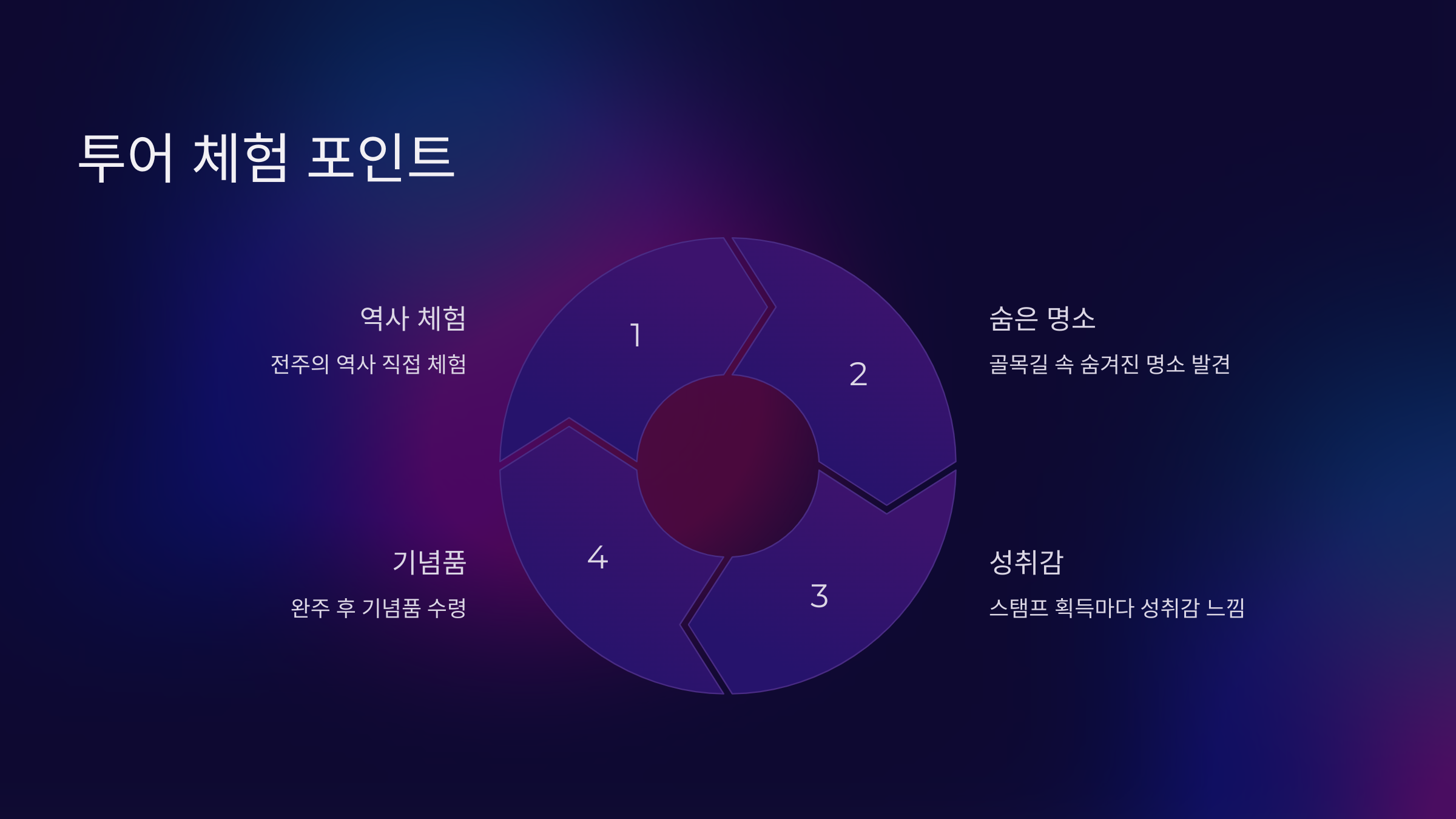 각 코스를 따라가며 전주의 역사와 문화를 체험할 수 있었어요. 특히 골목길을 탐방하며 숨겨진 명소들을 발견하는 재미가 쏠쏠했습니다. 스탬프를 찍을 때마다 성취감도 느껴지고, 완주 후 받는 기념품도 만족스러웠어요. 참여 후기