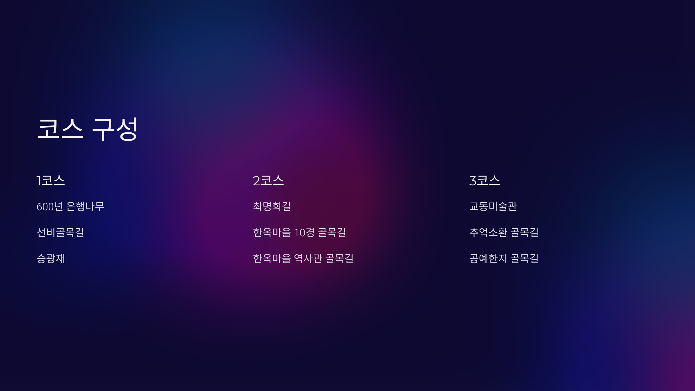 • 2코스: 최명희길, 한옥마을 10경 골목길, 한옥마을 역사관 골목길 등