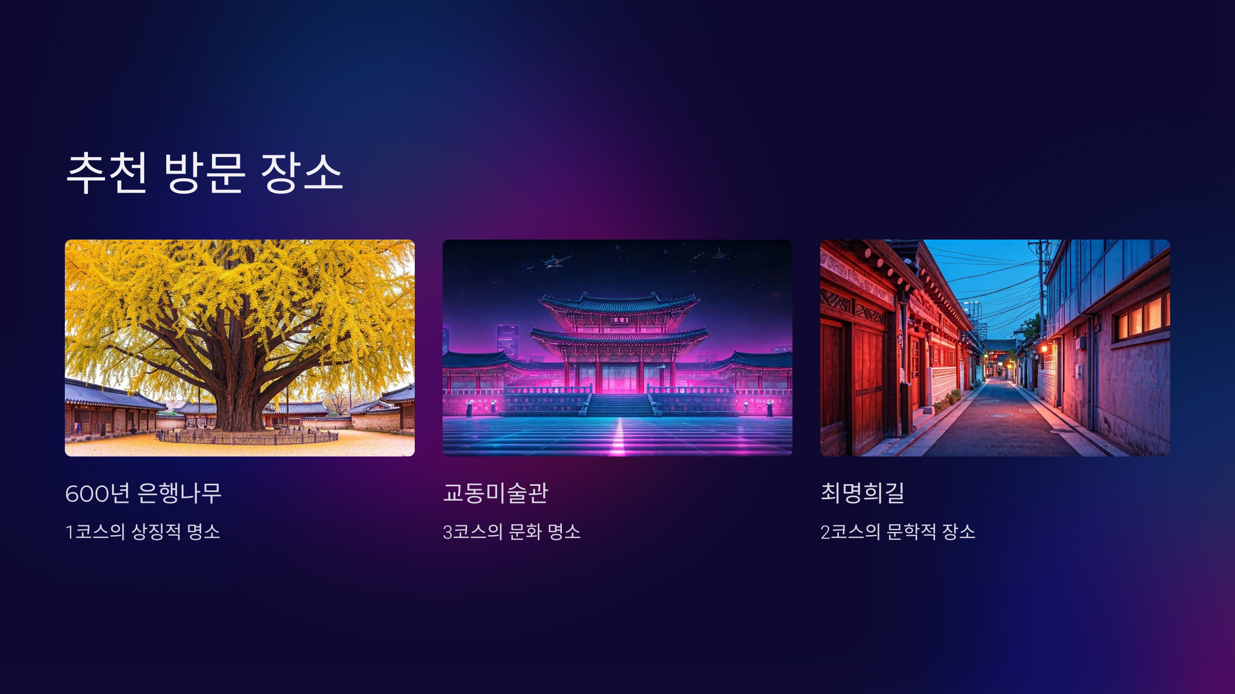 - 3코스: 교동미술관, 추억소환 골목길, 공예한지 골목길 등