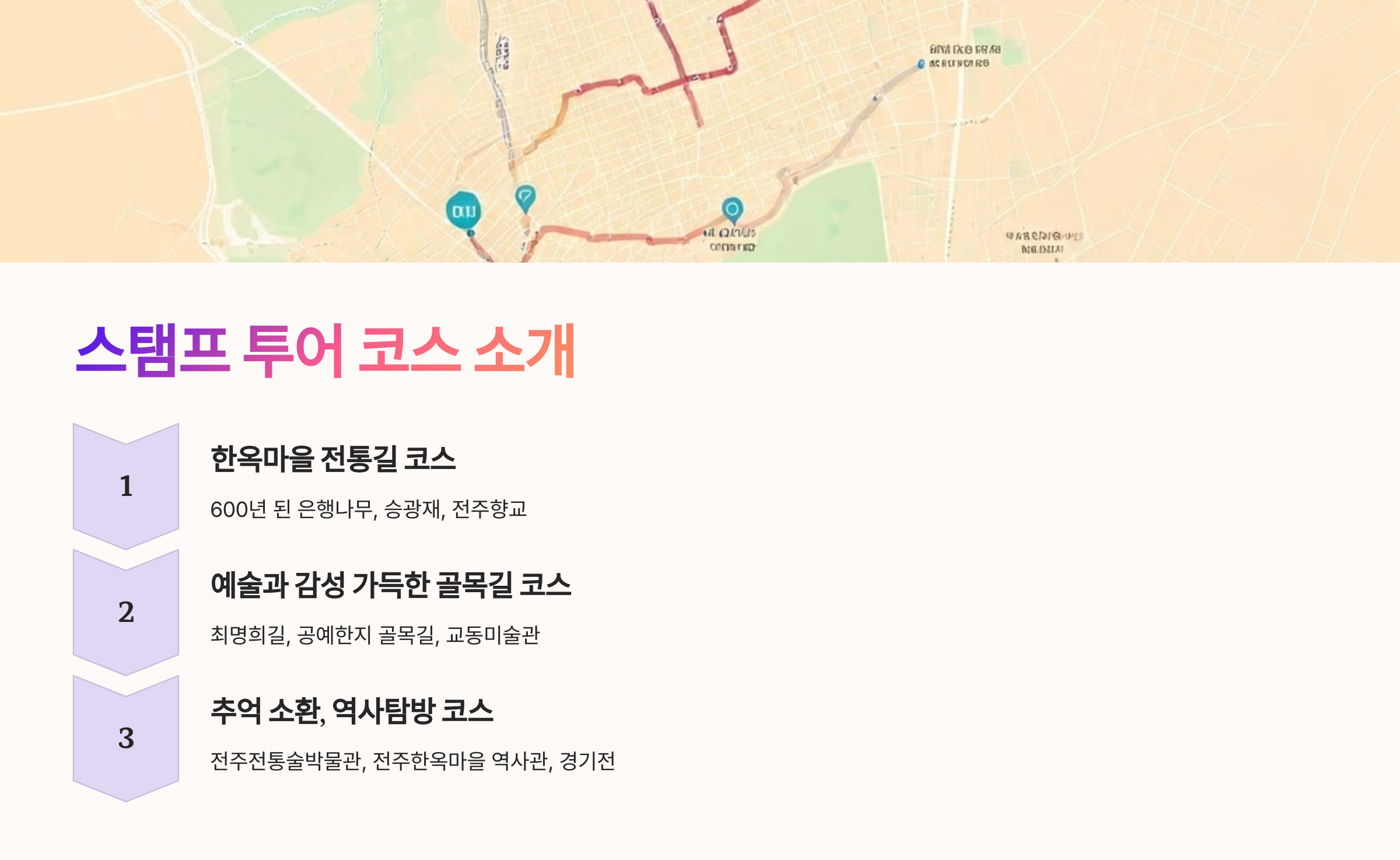 스탬프 투어는 3개의 주요 코스로 나뉘어 있어요. 각 코스를 완주하면 전주의 역사와 문화를 자연스럽게 익힐 수 있습니다.