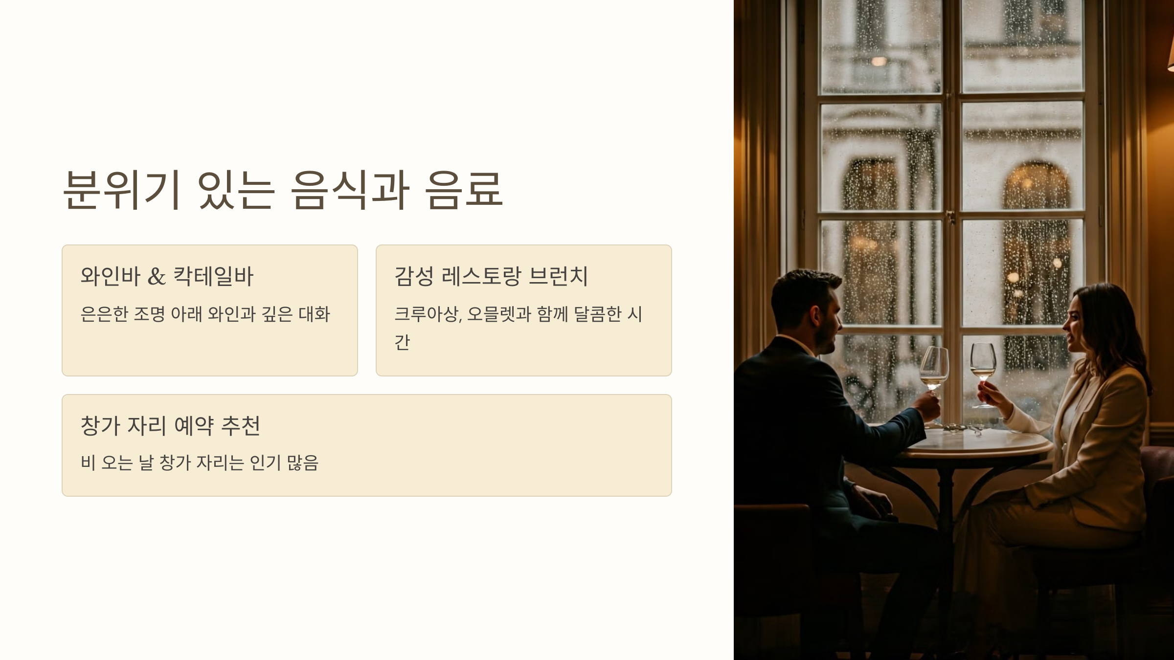 비 오는 날에는 분위기 좋은 레스토랑에서 여유로운 브런치를 즐기는 것도 좋아요. 🥞 크루아상과 커피, 오믈렛 한 접시와 함께 달콤한 시간을 보내보세요. 대화도 나누고, 사진도 찍으면서 로맨틱한 분위기를 만끽할 수 있답니다. 비 오는 날엔 유독 창가 자리가 인기가 많으니 미리 예약하는 것도 좋은 방법이에요.