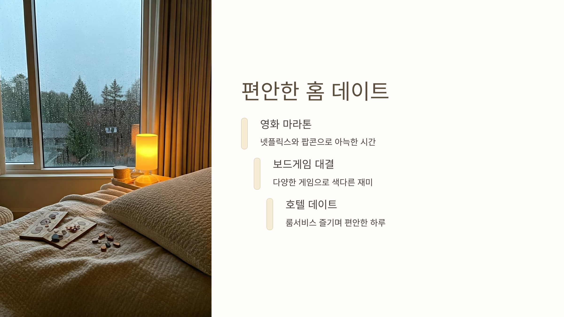 비 오는 날 집에서 조용히 데이트를 즐기는 것도 좋은 방법이에요! 🍿 넷플릭스를 보면서 팝콘을 먹거나, 보드게임을 하면서 시간을 보내는 것도 색다른 재미를 줄 수 있어요. 또는 근사한 호텔에서 룸서비스를 즐기며 편안한 하루를 보내는 것도 로맨틱한 선택이 될 수 있죠.
