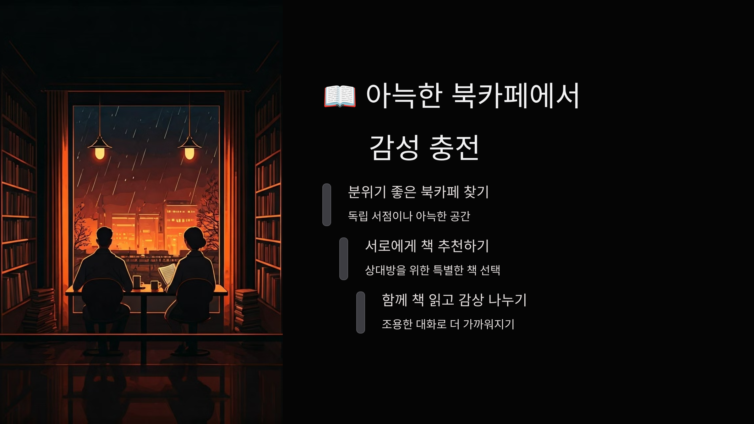 비 오는 날의 감성은 북카페에서 완성돼요. 빗소리를 배경으로 따뜻한 차 한 잔과 함께 책을 읽으면 둘만의 조용한 시간을 보낼 수 있어요. 📚✨