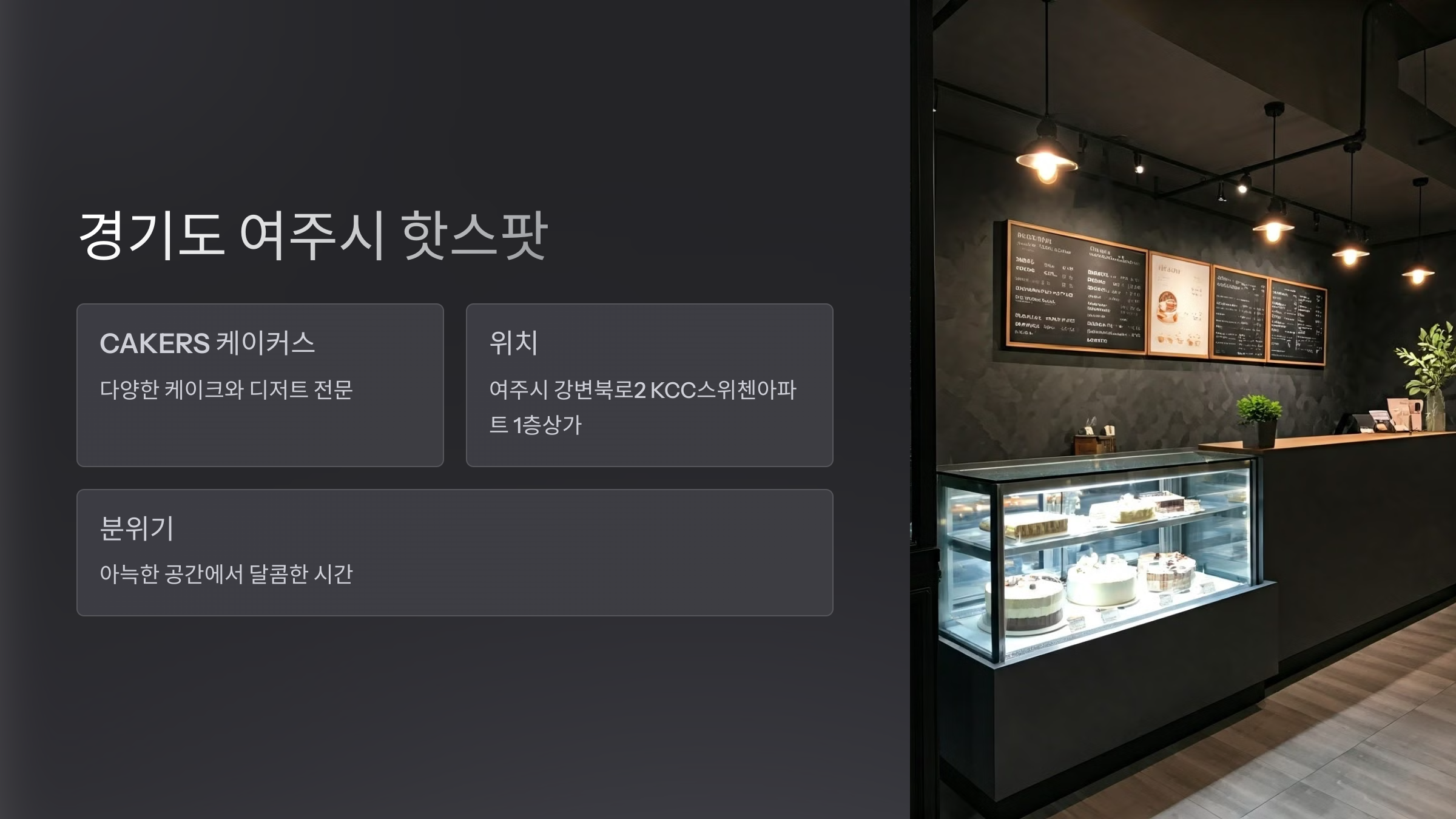 • 특징: 다양한 케이크와 디저트를 전문으로 하는 카페로, 아늑한 분위기에서 달콤한 시간을 보낼 수 있습니다.