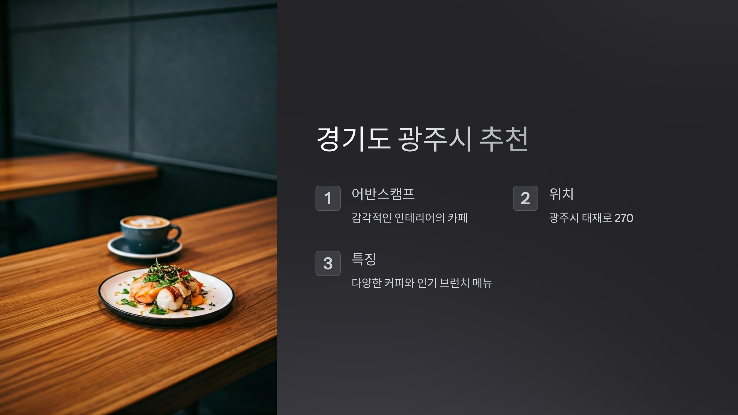 • 특징: 감각적인 인테리어와 함께 다양한 커피 메뉴를 즐길 수 있는 곳으로, 특히 브런치 메뉴가 인기입니다.