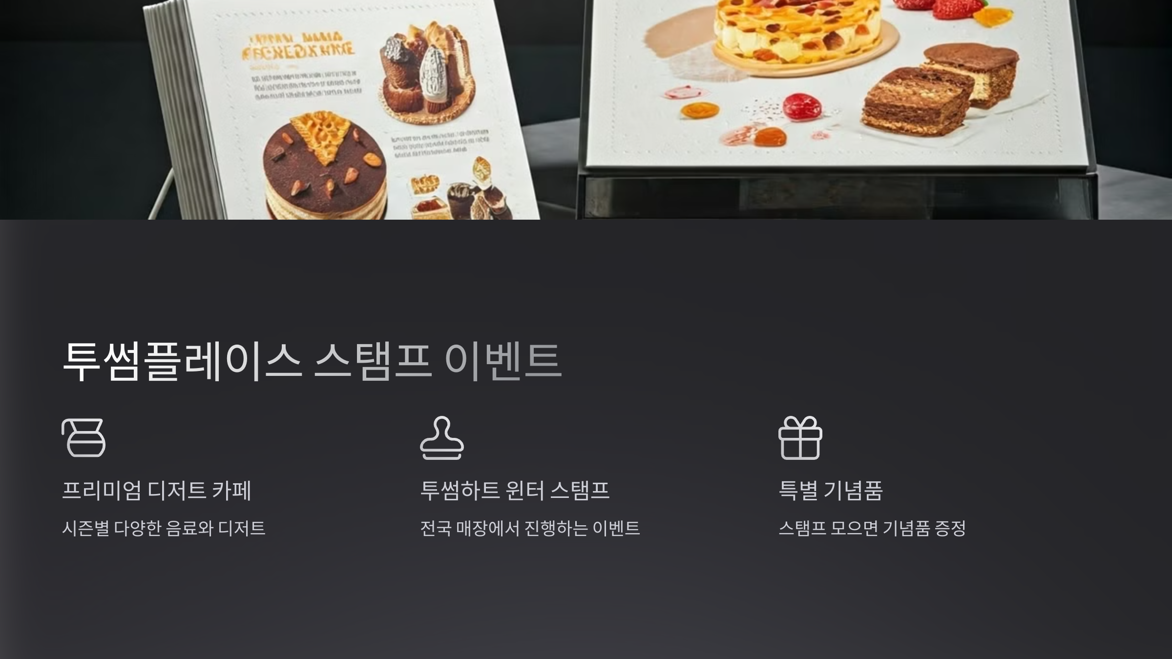 - 특징: 프리미엄 디저트 카페로, 시즌별로 다양한 음료와 디저트를 제공합니다. '투썸하트 윈터 스탬프 이벤트' 등 다양한 프로모션을 진행하며, 스탬프를 모으면 특별한 기념품을 받을 수 있습니다. 관련 정보