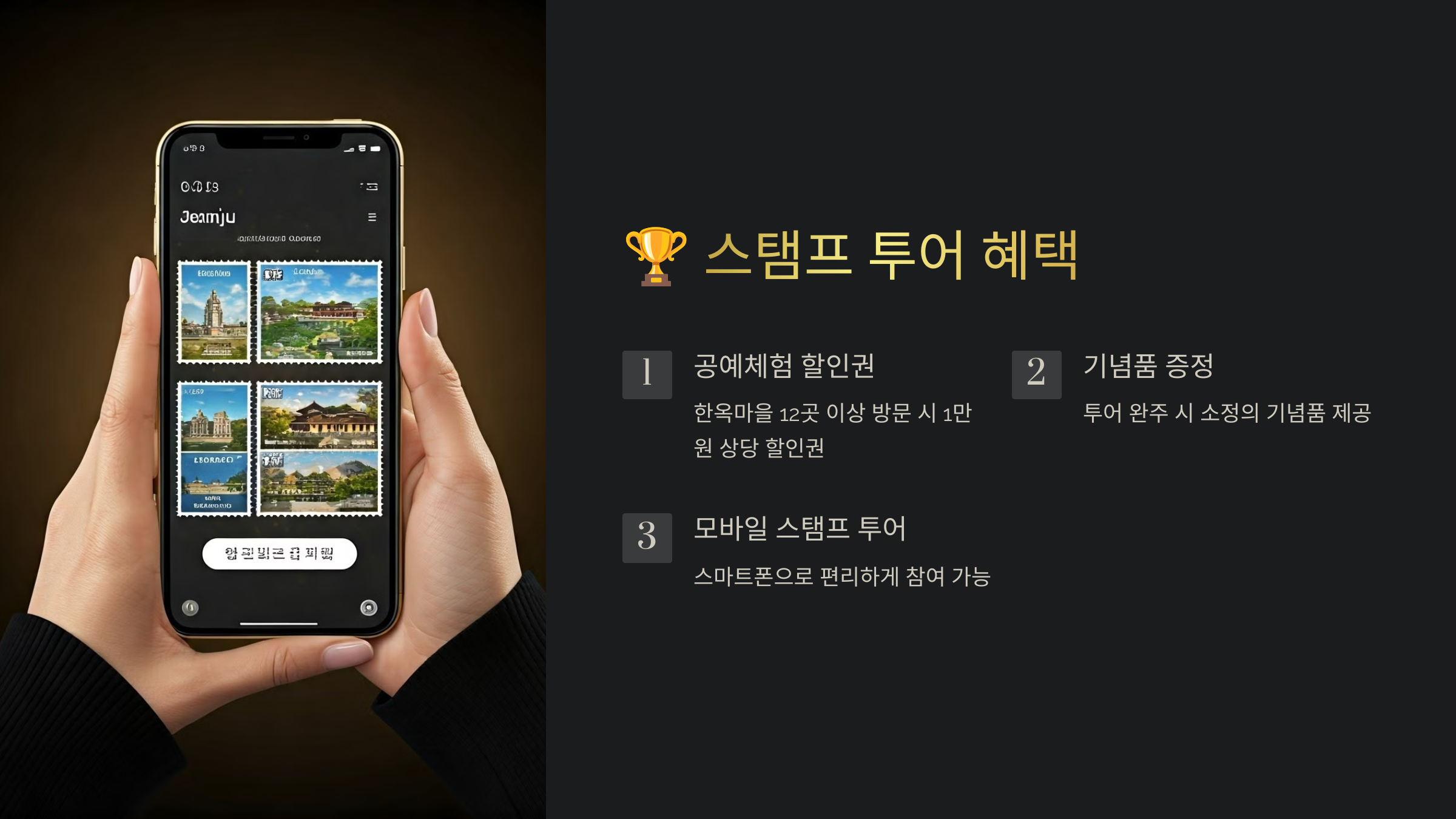 • 공예체험 할인권 제공: 한옥마을 내 공방 12곳 이상에서 스탬프를 찍으면 1만 원 상당의 공예체험 할인권을 받을 수 있습니다. 이를 통해 전통 공예를 저렴하게 체험할 수 있어요.