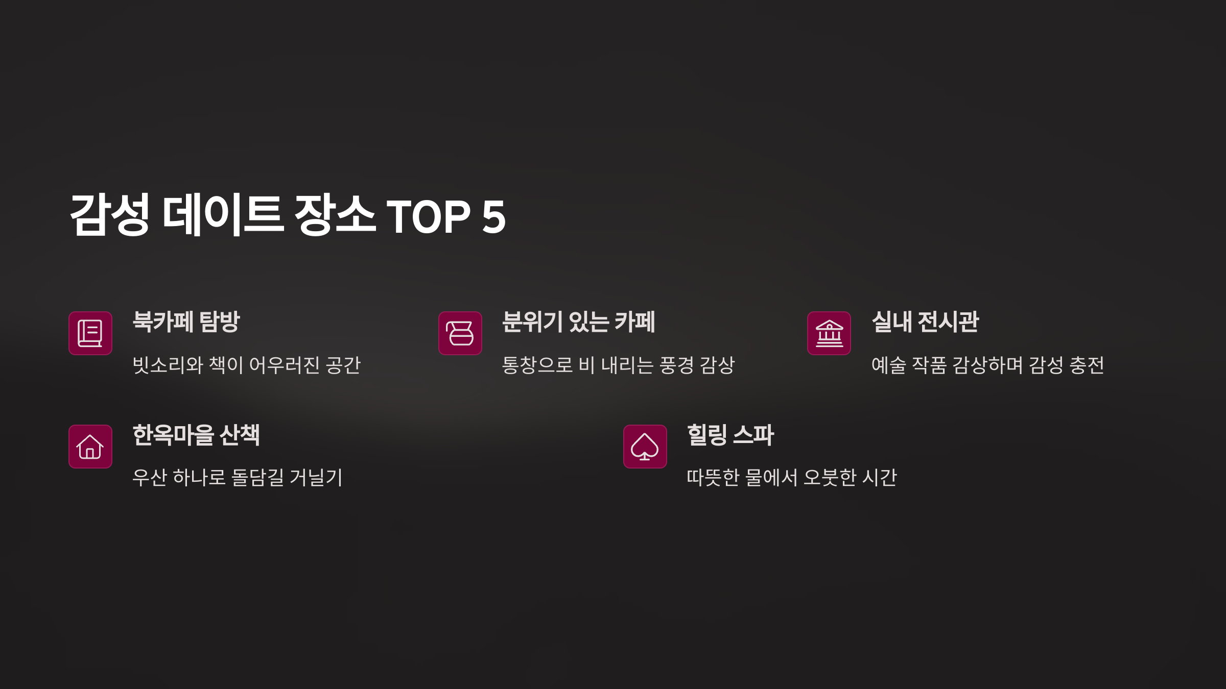 비 오는 날은 괜히 마음이 몽글몽글해지죠. 이런 날, 사랑하는 사람과 함께라면 그 감성은 두 배가 되는데요! 비 때문에 데이트가 망할까 봐 걱정이라면 오히려 반대로 생각해보세요. 오늘은 비 오는 날에도 걷고 싶어지는, 혹은 실내에서 따뜻하게 추억을 쌓을 수 있는 감성 데이트 장소 TOP 5를 소개해드릴게요! ☔💑