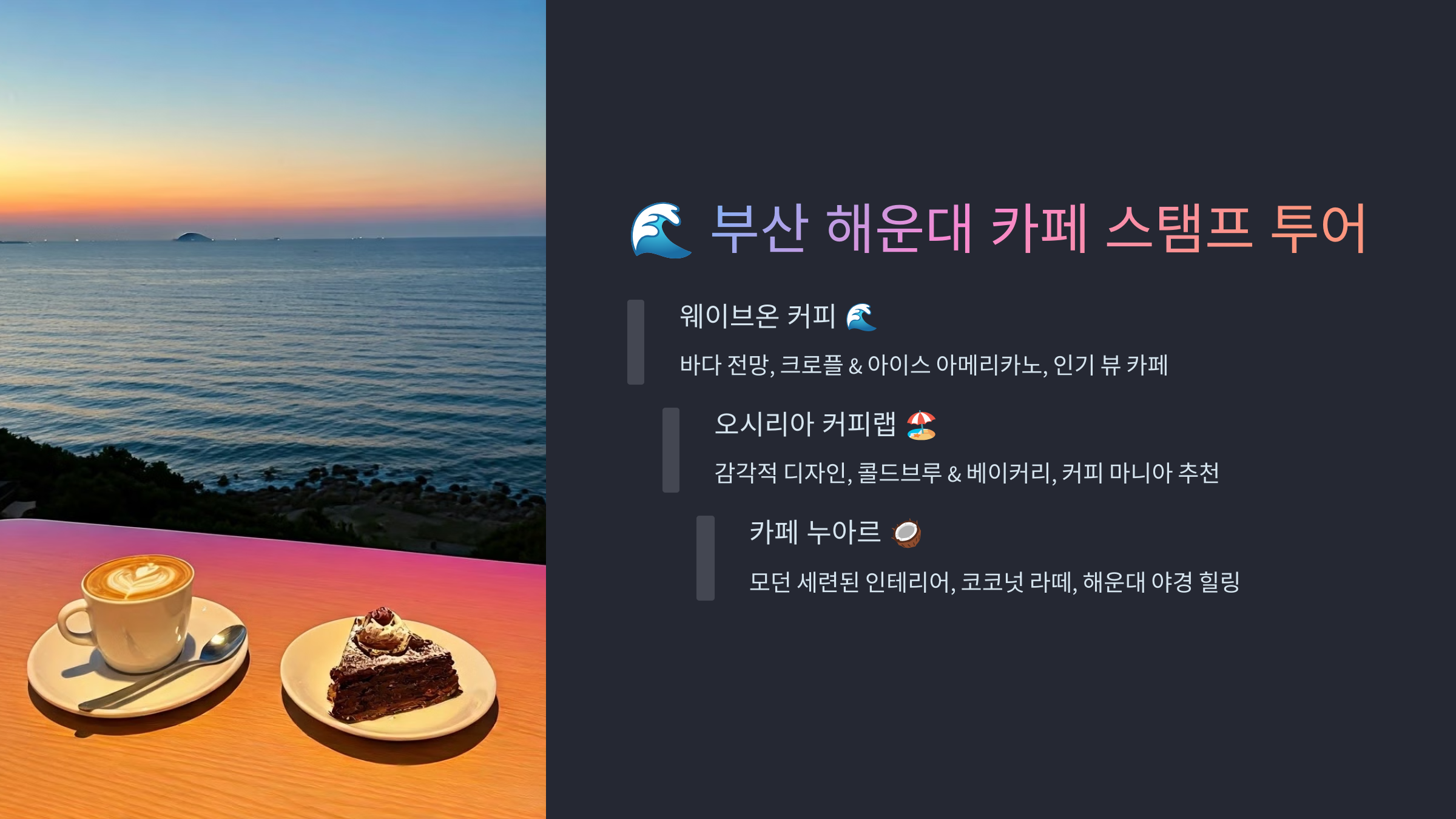 ✔️ 특징: 해운대에서 가장 인기 있는 뷰 카페
