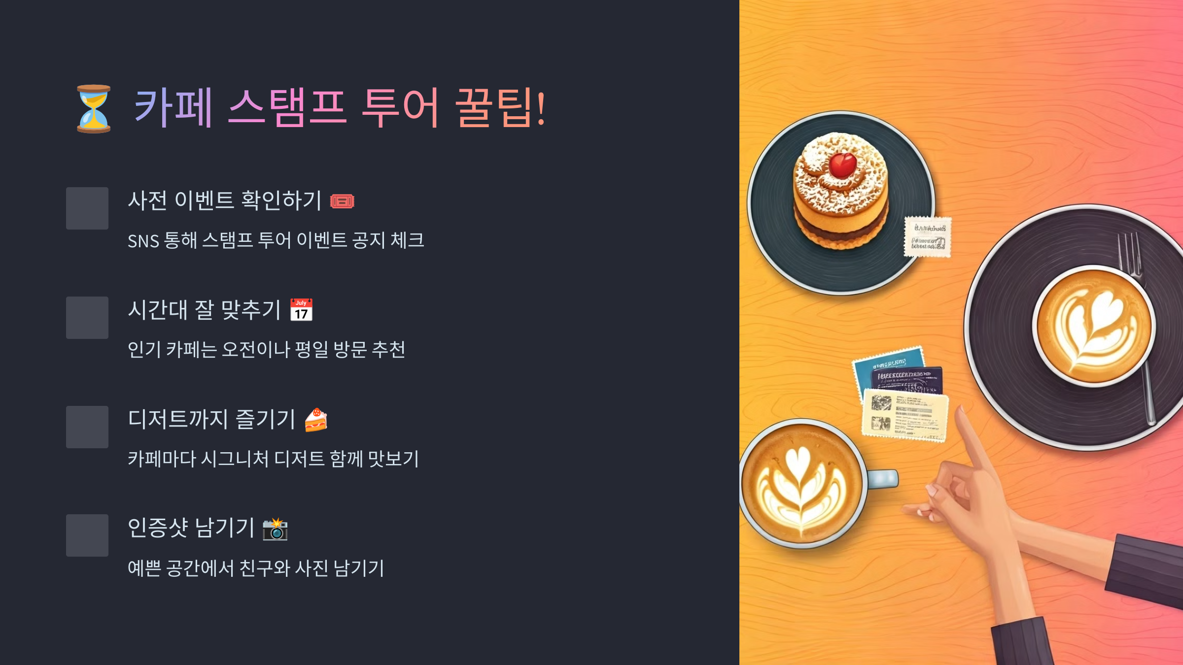 | 11_전국 카페 스탬프 투어: 가장 핫한 카페 리스트! (0) | 2025.03.17 |