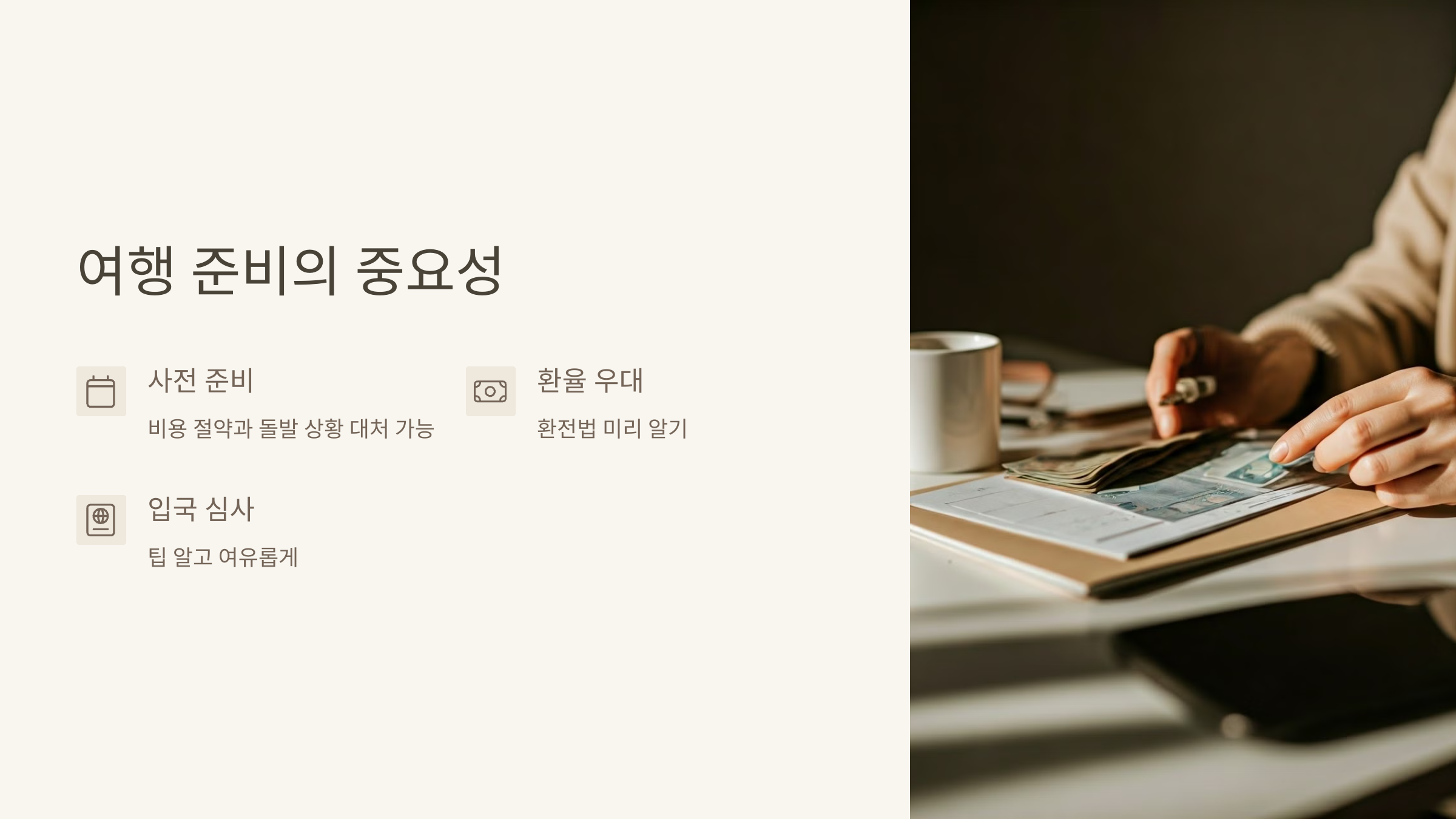 처음 여행을 계획할 땐 설렘 반, 두려움 반이더라구요. 저도 첫 해외여행 땐 ‘이게 맞는 걸까?’ 하는 마음이 컸어요. 그래서 준비가 정말 중요합니다. 사전 준비는 비용을 절약할 뿐 아니라 여행 중 돌발 상황에도 유연하게 대처할 수 있는 힘이 돼요. 예를 들어 환율 우대받는 환전법, 입국 심사 팁 등을 알고 가면 훨씬 여유 있게 움직일 수 있답니다. ✨