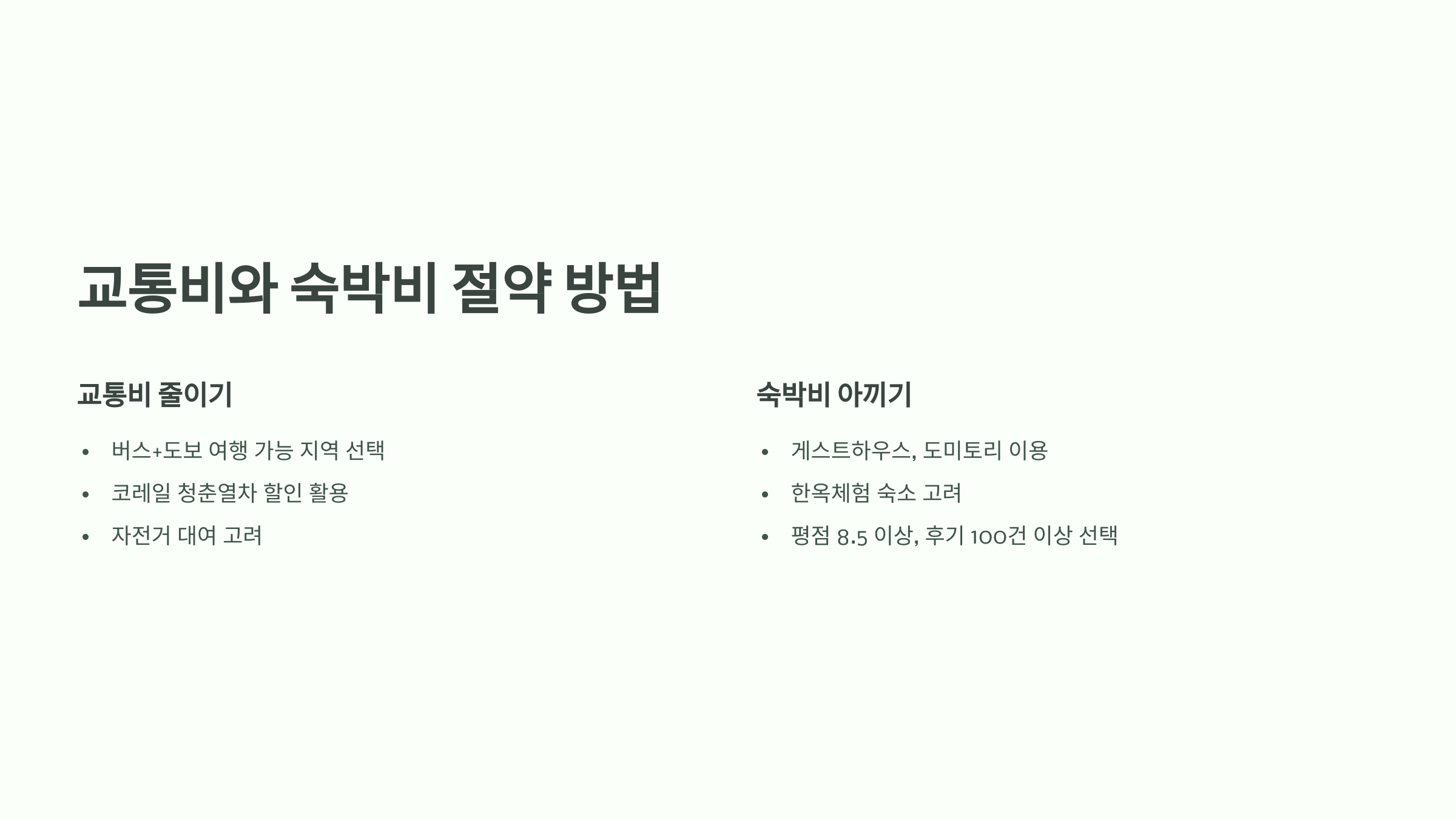 가성비 여행에서 교통비는 은근히 큰 비중을 차지해요. 그래서 저는 버스+도보 여행이 가능한 지역을 우선 고려합니다. 예를 들어, 군산은 시내가 작아서 자전거나 도보로 대부분 커버 가능해요. 그리고 코레일의 ‘청춘열차 할인’ 같은 걸 활용하면 KTX도 훨씬 저렴하게 이용할 수 있어요. 교통비를 아낄수록 그만큼 더 많은 걸 누릴 수 있답니다. 🚎🚶