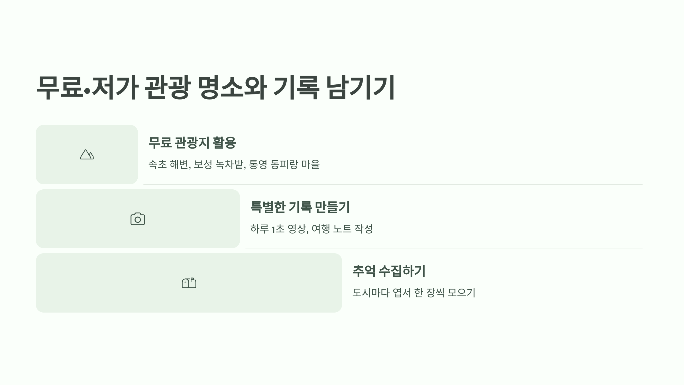 돈을 쓰지 않아도 즐길 수 있는 곳이 많습니다! 예를 들어, 속초 해변 산책로, 보성 녹차밭, 군산 근대문화유산 탐방, 통영 동피랑 마을 등은 입장료가 없거나 저렴하면서도 풍경이 멋져요. 저는 이런 곳에서 사진도 찍고, 하루 종일 여유롭게 보내는 걸 좋아해요. 필카나 폴라로이드 하나 챙기면 감성 여행 완성입니다 📷🌅
