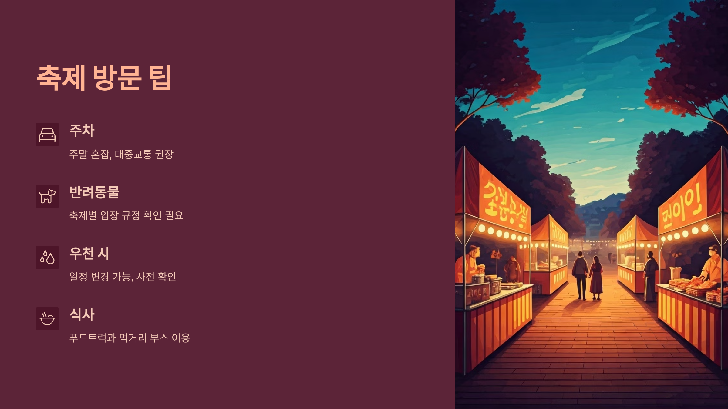 일부 축제는 우천 시 일정이 변경될 수 있으니, 날씨가 좋지 않을 경우 사전에 확인하시는 것이 좋아요.