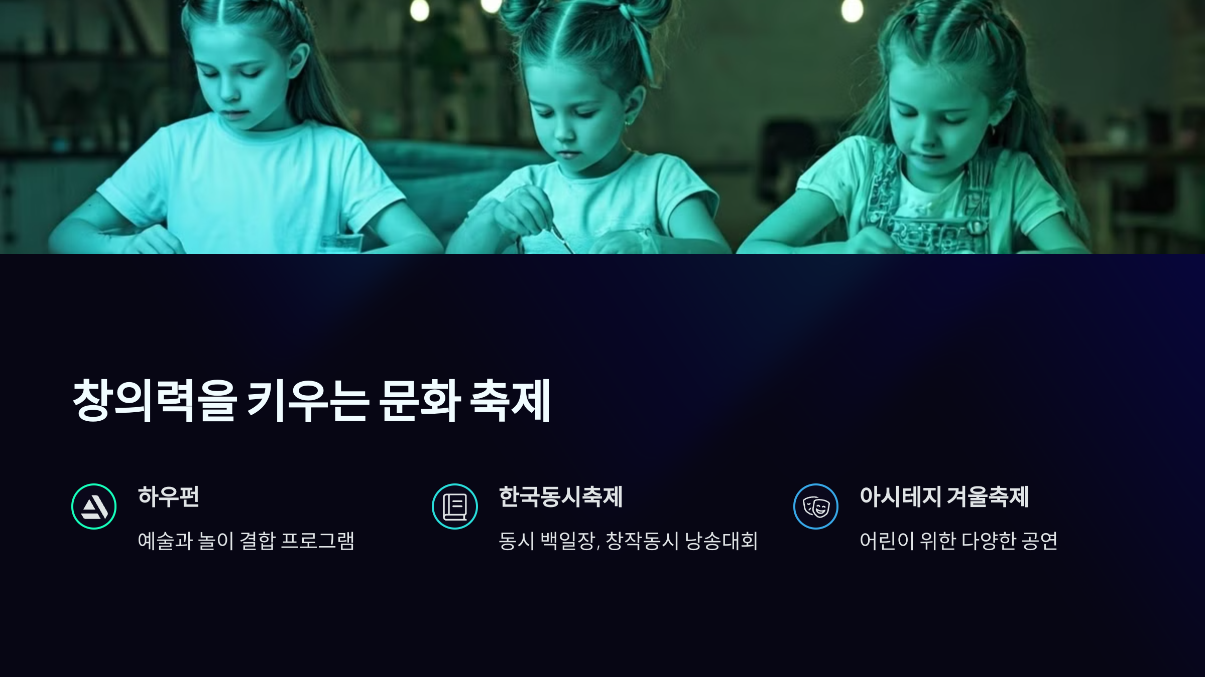 겨울방학 기간에 열리는 '서울 아시테지 겨울축제'는 어린이와 청소년을 위한 다양한 공연이 펼쳐지는 축제예요. 연극, 무용, 음악 등 다양한 장르의 공연을 통해 아이들에게 문화 예술의 즐거움을 선사해요. 자세한 정보