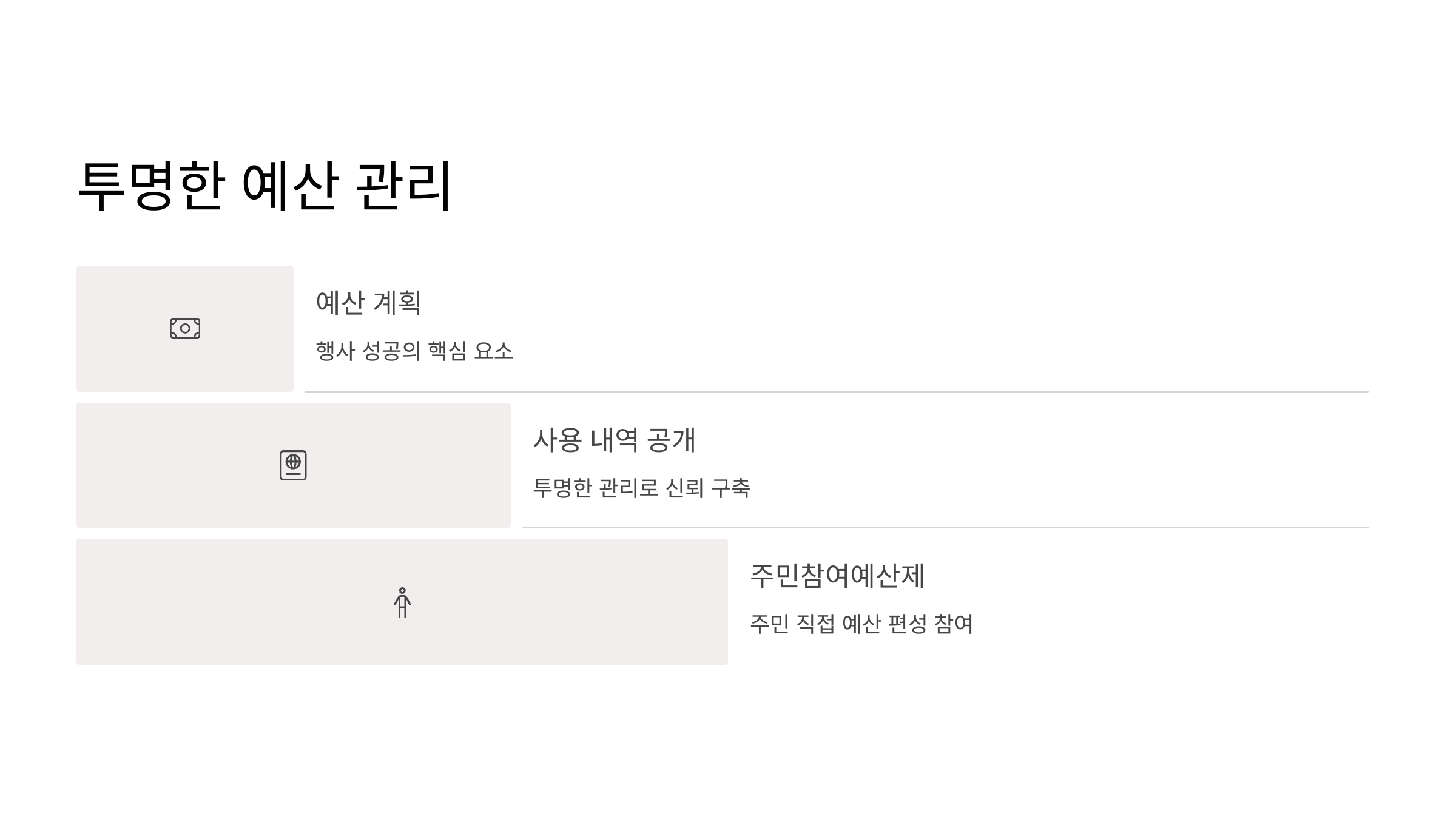 예산은 행사의 성공적인 진행을 위한 핵심 요소입니다. 예산의 사용 내역을 투명하게 관리하고, 이를 주민들에게 공개함으로써 신뢰를 구축할 수 있습니다. 또한, 주민참여예산제를 활용하여 주민들이 직접 예산 편성에 참여하도록 유도하는 것도 좋은 방법입니다. 참고: 서울시 시민참여예산 안내