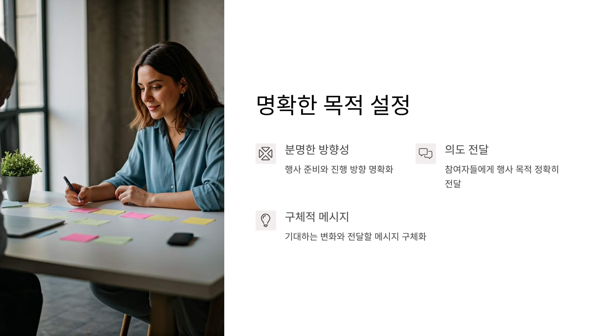 행사의 목적과 목표를 분명히 정하는 것은 매우 중요합니다. 이를 통해 행사 준비와 진행 방향이 명확해지고, 참여자들에게도 행사의 의도를 정확히 전달할 수 있습니다. 예를 들어, 환경 보호를 주제로 한 행사라면, 구체적으로 어떤 메시지를 전달하고 싶은지, 어떤 변화를 기대하는지를 명확히 해야 합니다.