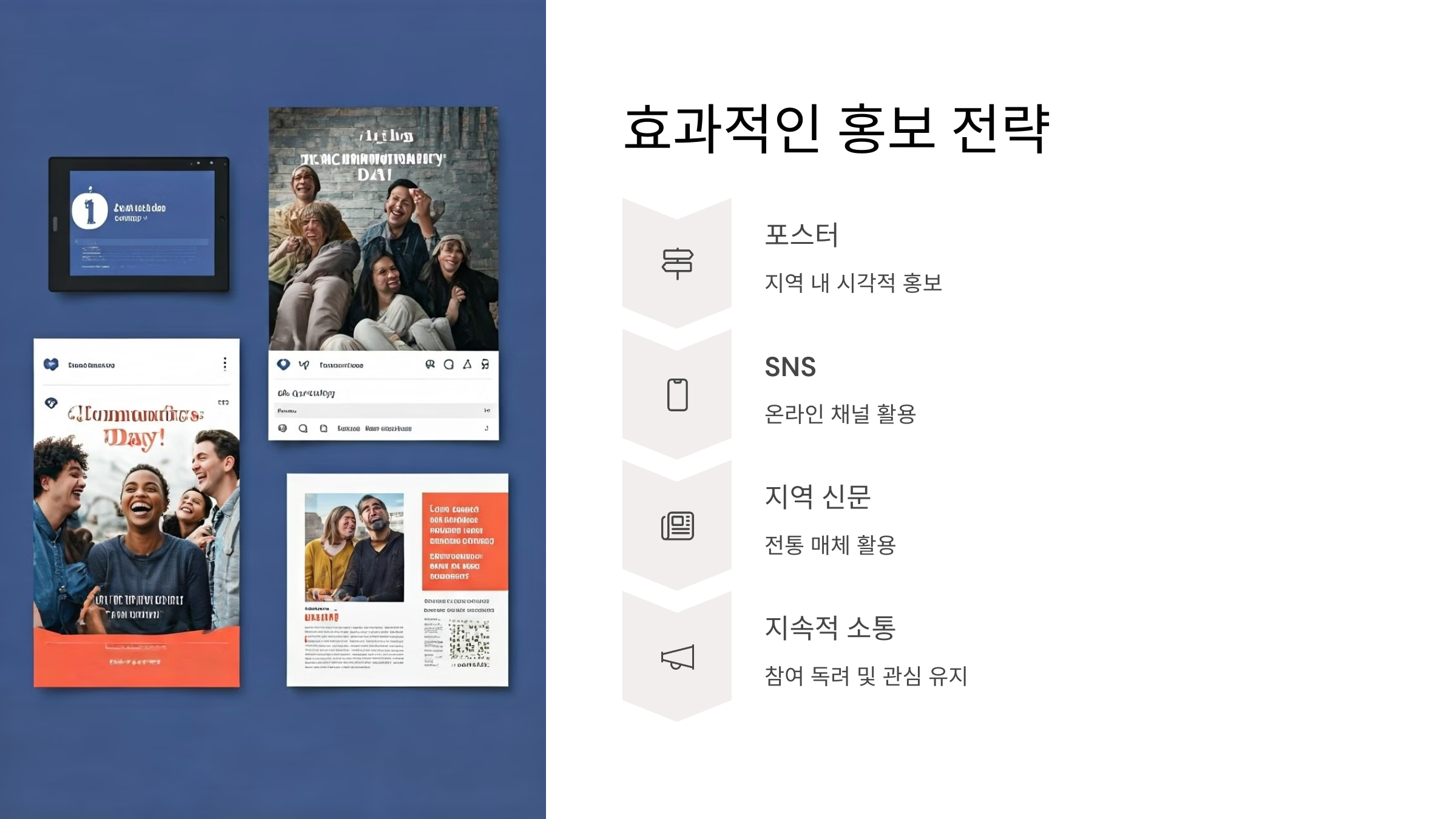 행사의 성공은 주민들의 참여에 달려 있습니다. 이를 위해 다양한 채널을 활용하여 지속적으로 홍보하고, 주민들과 소통하세요. 포스터, SNS, 지역 신문 등 다양한 매체를 활용하여 행사의 일시, 장소, 내용 등을 알리고, 주민들의 관심과 참여를 유도하세요.