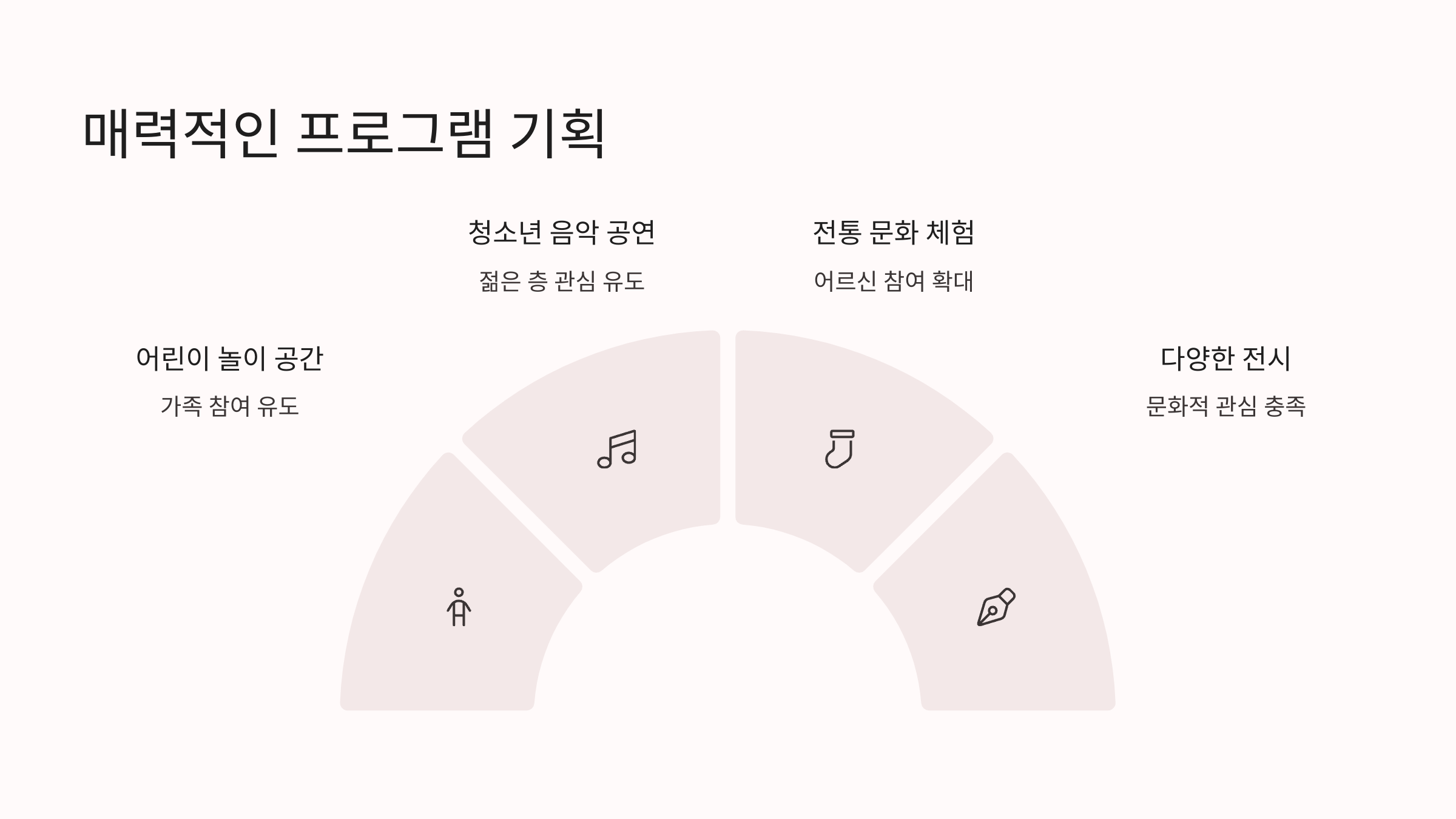 주민들의 관심을 끌 수 있는 다양한 프로그램을 기획하는 것이 중요합니다. 연령대와 취향을 고려하여 문화 공연, 체험 활동, 전시 등 다양한 콘텐츠를 제공하면 참여율을 높일 수 있습니다. 예를 들어, 어린이를 위한 놀이 공간, 청소년을 위한 음악 공연, 어르신들을 위한 전통 문화 체험 등을 마련할 수 있습니다.