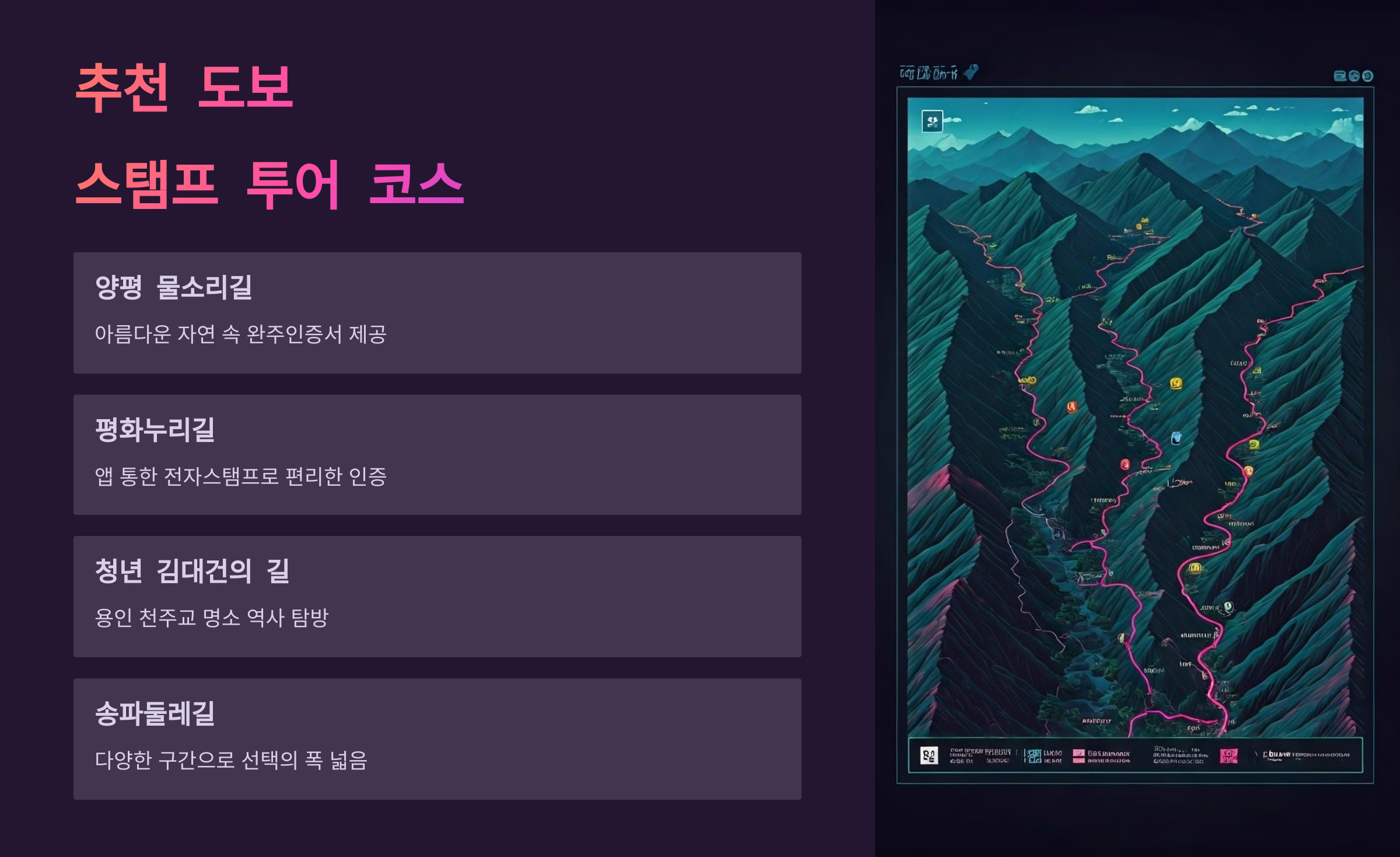 - 스탬프 수집: 코스 내 각 지점에서 스탬프를 찍습니다.
