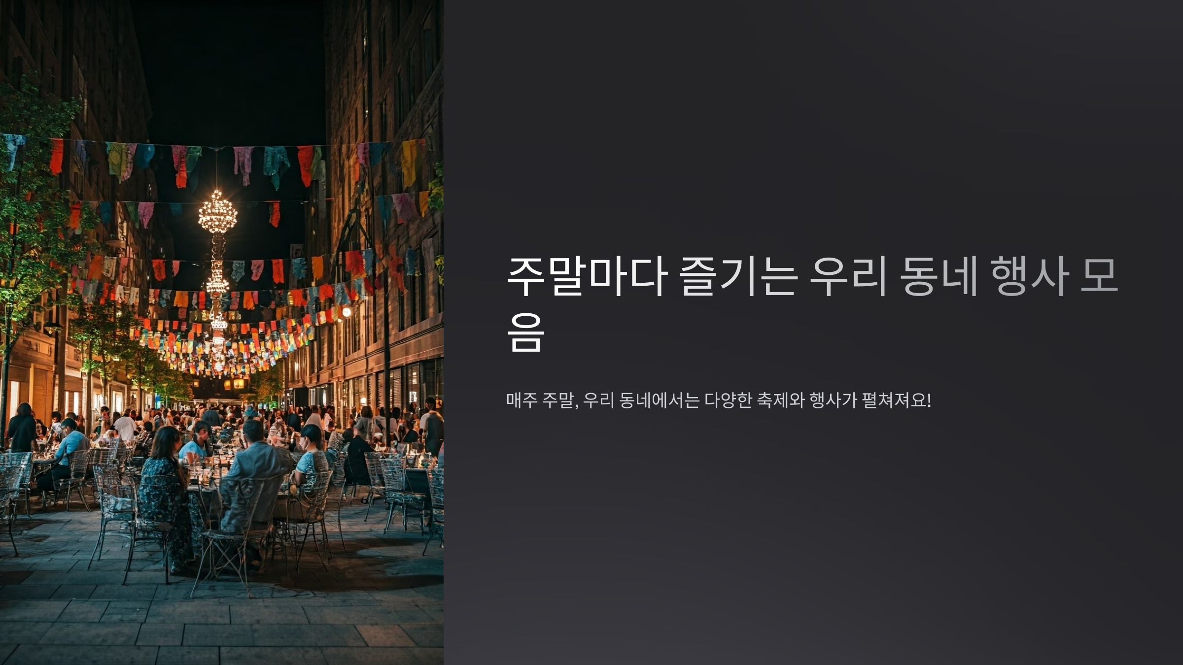 매주 주말, 우리 동네에서는 다양한 축제와 행사가 펼쳐져요! 어떤 행사들이 기다리고 있는지 함께 알아볼까요? 😊