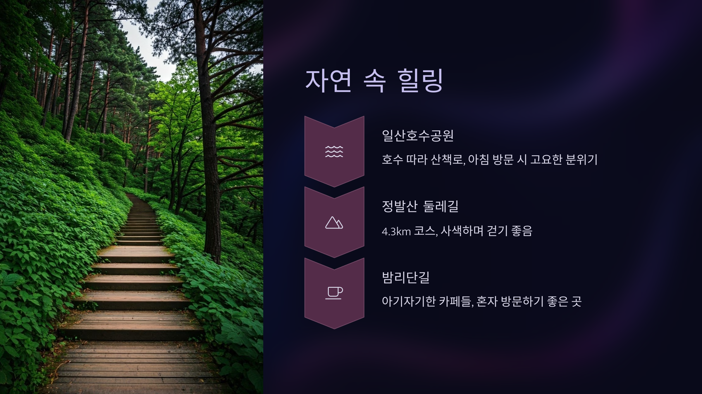 정발산 둘레길은 혼자서 사색하며 걷기 좋은 코스예요. 약 4.3km의 길을 따라 걸으며 자연과 하나 되는 시간을 가져보세요. 길을 따라 밤리단길의 아기자기한 카페들도 만나볼 수 있어요. 코스 상세 정보