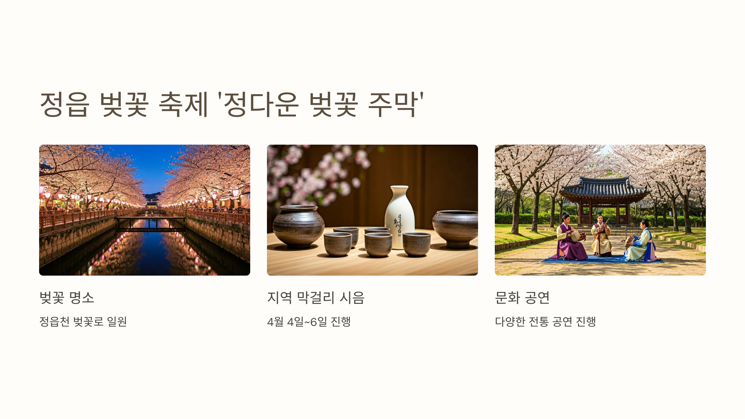| 정읍 벚꽃 축제 '정다운 벚꽃 주막' | 전북 정읍 | 4월 4일 ~ 4월 6일 | 벚꽃과 함께하는 전통 주막 체험 및 지역 막걸리 시음 |