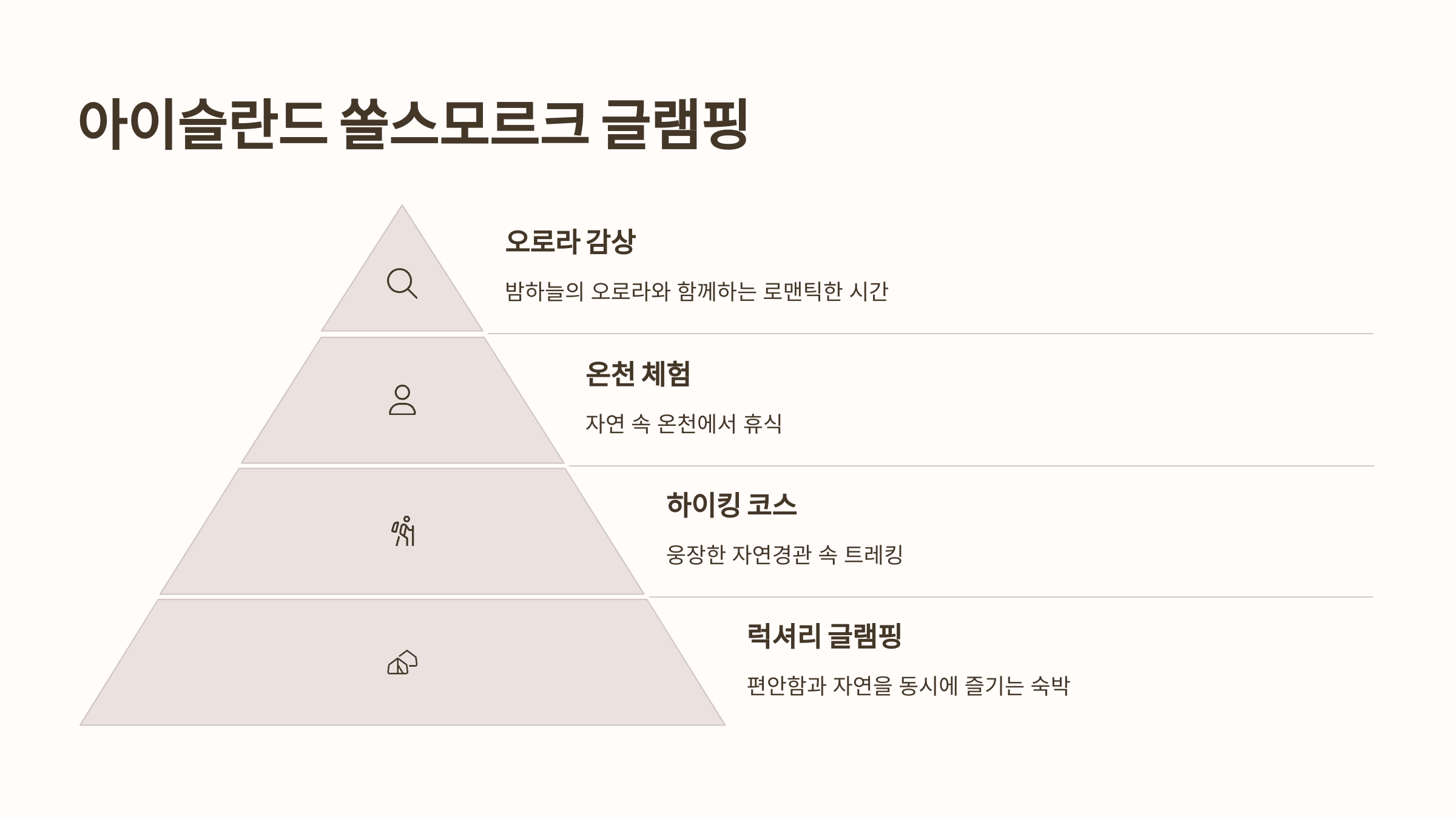 • 특징: 웅장한 자연경관 속에서 럭셔리한 글램핑을 즐길 수 있는 곳으로, 하이킹과 온천을 함께 경험할 수 있어요. 밤에는 오로라를 감상하며 로맨틱한 시간을 보낼 수 있습니다. 자연과 하나 되는 특별한 경험을 연인과 함께해보세요. 더 알아보기