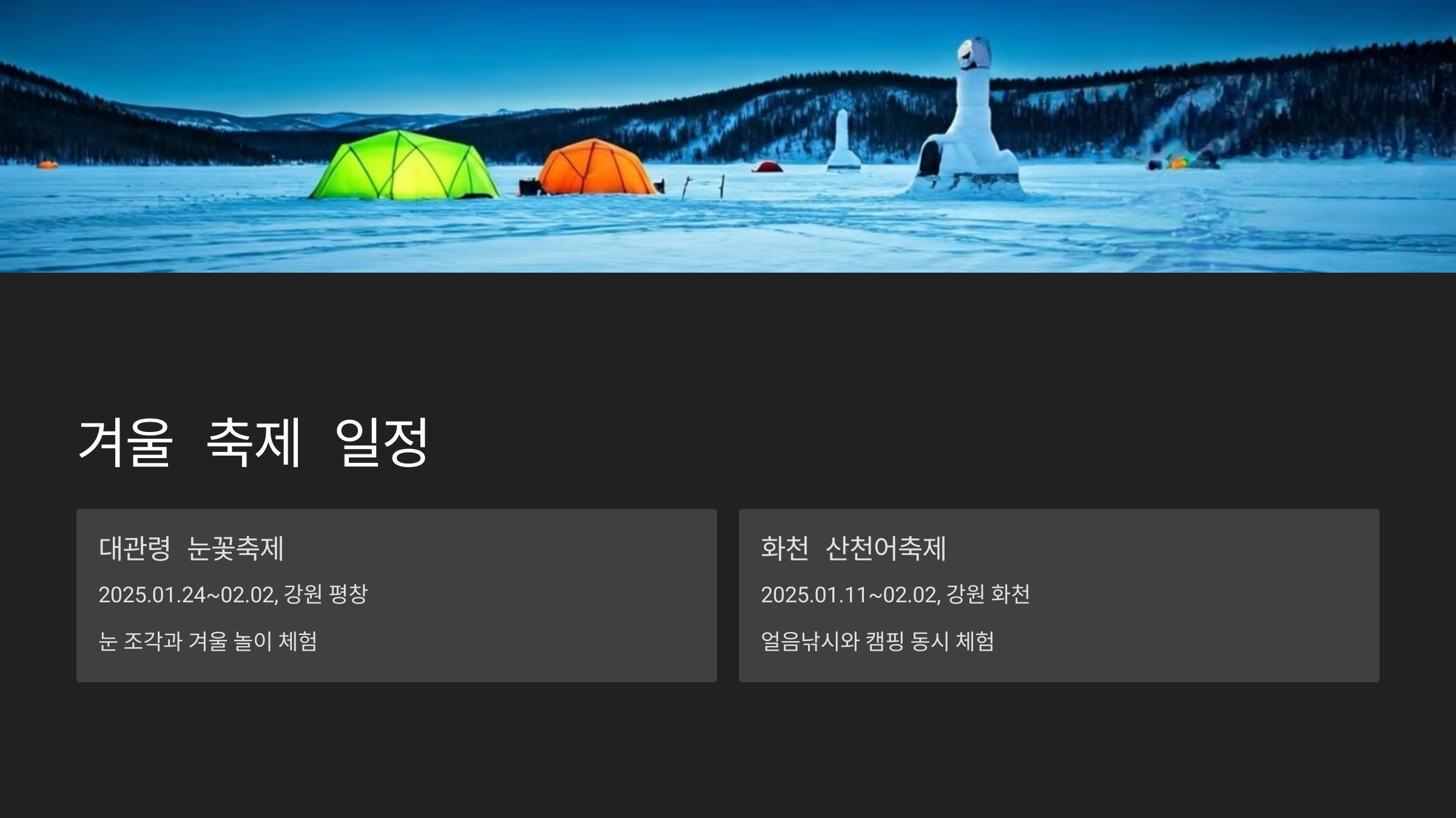 | 대관령 눈꽃축제 | 강원 평창 | 2025.01.24 ~ 2025.02.02 | 겨울 캠핑과 함께하는 눈꽃의 향연! 다양한 눈 조각과 겨울 놀이를 즐길 수 있습니다. |